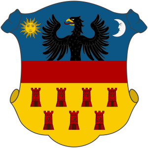 A black eagle or Turul facing Dexter, sun, with a gold bill & red tongue representing the Hungarian nobles, The Sun, Dexter, and the crescent Moon representing the Szeklers. Seven red towers with black doors representing the seven fortified cities (fortresses) of the Transylvania Saxons.